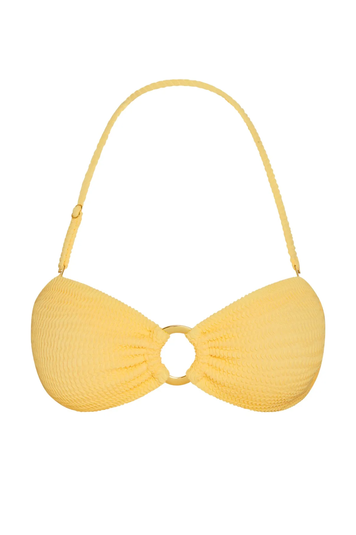 Soak in the sun while wearing the Costa Rica Top. This bandeau style top features a center front gold ring hardware and a removable halter strap that can be adjusted for the perfect amount of lift and support for all your beach adventures. Perfect for cup sizes A-D! Our super supportive and flattering crinkle fabric is fully lined and tailored to make you look and feel your best.