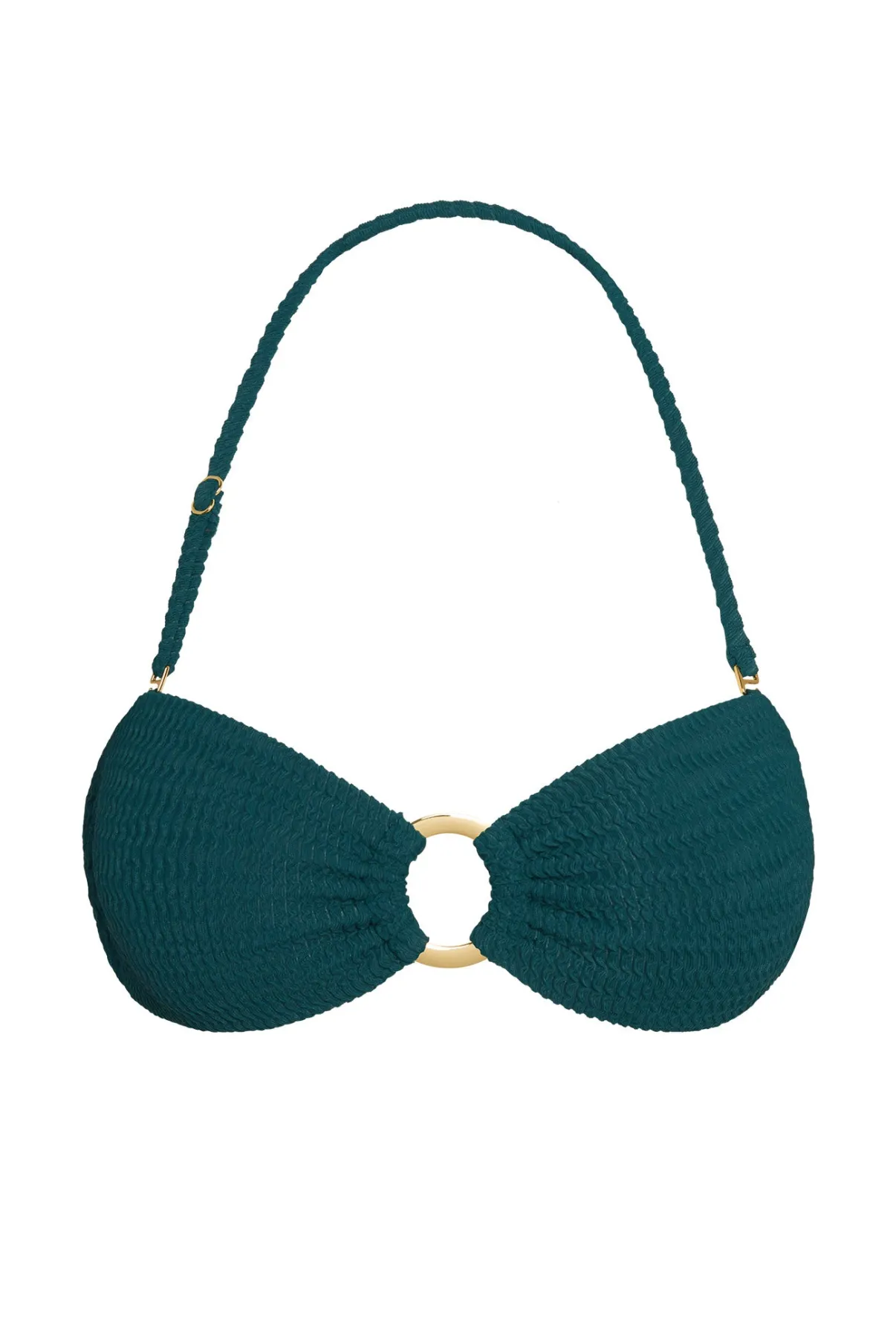 Soak in the sun while wearing the Costa Rica Top. This bandeau style top features a center front gold ring hardware and a removable halter strap that can be adjusted for the perfect amount of lift and support for all your beach adventures. Perfect for cup sizes A-D! Our super supportive and flattering crinkle fabric is fully lined and tailored to make you look and feel your best.