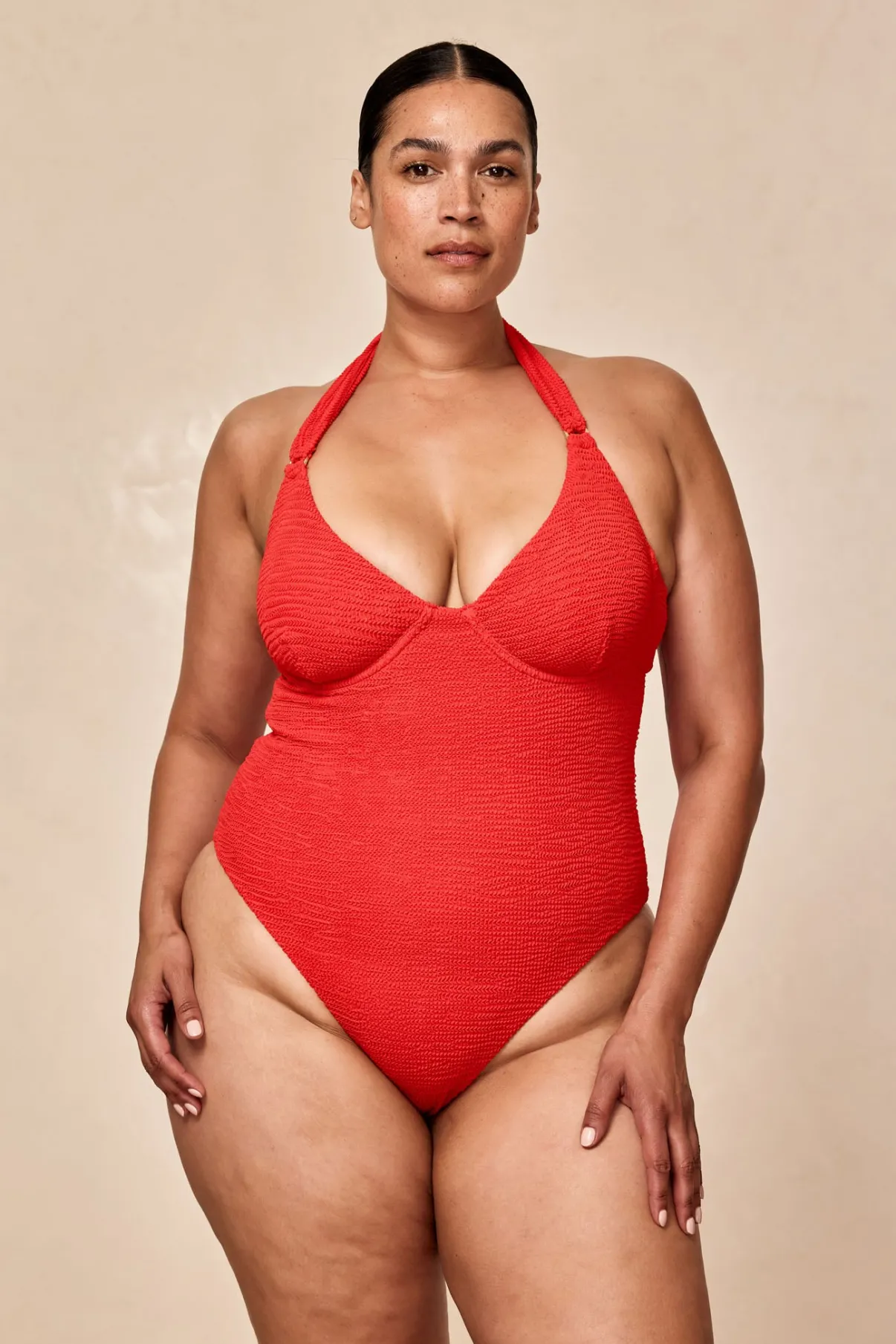 If you love the support of our Honolulu Top but crave the elegance of a one piece, look no further! The Honolulu One Piece features a flattering high leg cut and cheeky bottom coverage that beautifully enhances any silhouette. Designed for maximum comfort and support, this one piece is complete with an adjustable halter neck tie closure. Our super supportive and flattering crinkle fabric is fully lined and tailored to make you look and feel your best.