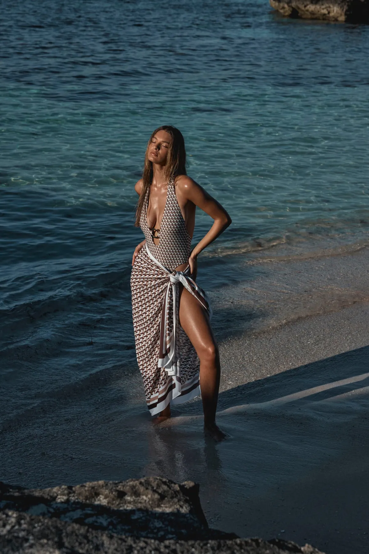 Versatile for all your over-swim needs, our Marina Piccola Sarong can be tied as a mini or midi length beach cover-up. Featuring our Monday branding throughout the design, this sarong can double as a top, sarong and scarf.