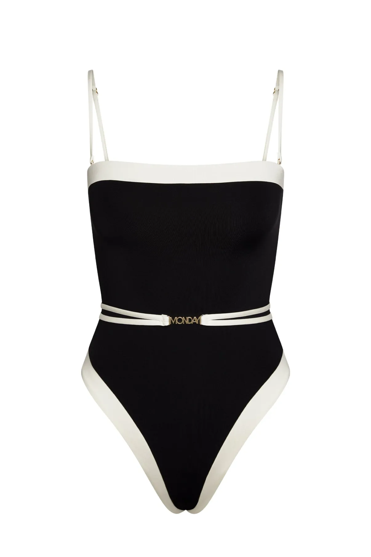 Dive into sophistication with our Miami One Piece. Featuring removable straps and a gold Monday logo removable belt for versatile flair, the strapless silhouette and cheeky coverage exude confidence, making it the perfect choice for a chic look on and off the sand.