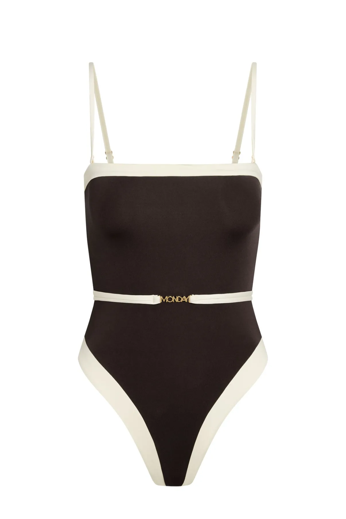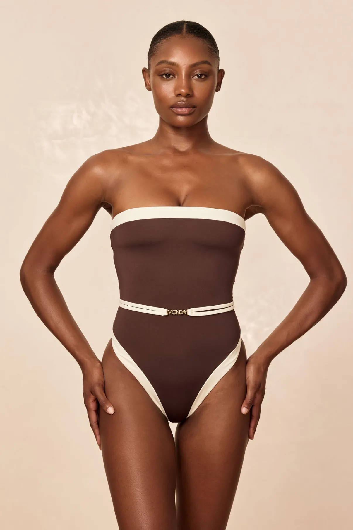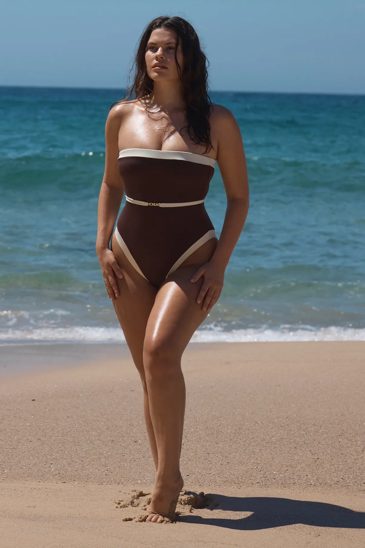 Dive into sophistication with our Miami One Piece. Featuring removable straps and a gold Monday logo removable belt for versatile flair, the strapless silhouette and cheeky coverage exude confidence, making it the perfect choice for a chic look on and off the sand.
