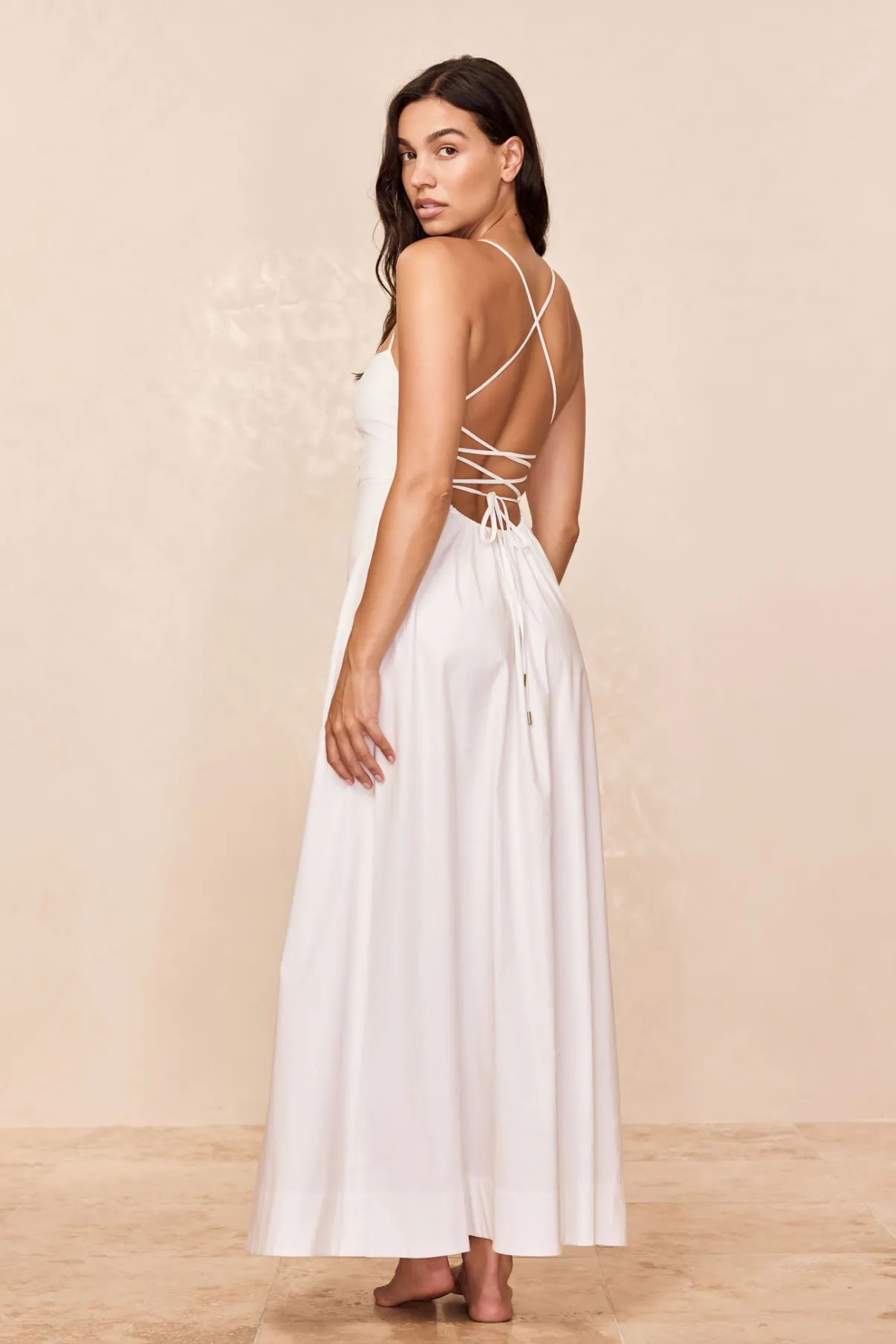 The Montpellier Dress features over-the-shoulder straps, a lace-up back for an adjustable fit, and a fitted waist that flatters every curve. With its ankle-length hem and effortless feel, it’s made for golden hours, date nights, and everything in between.