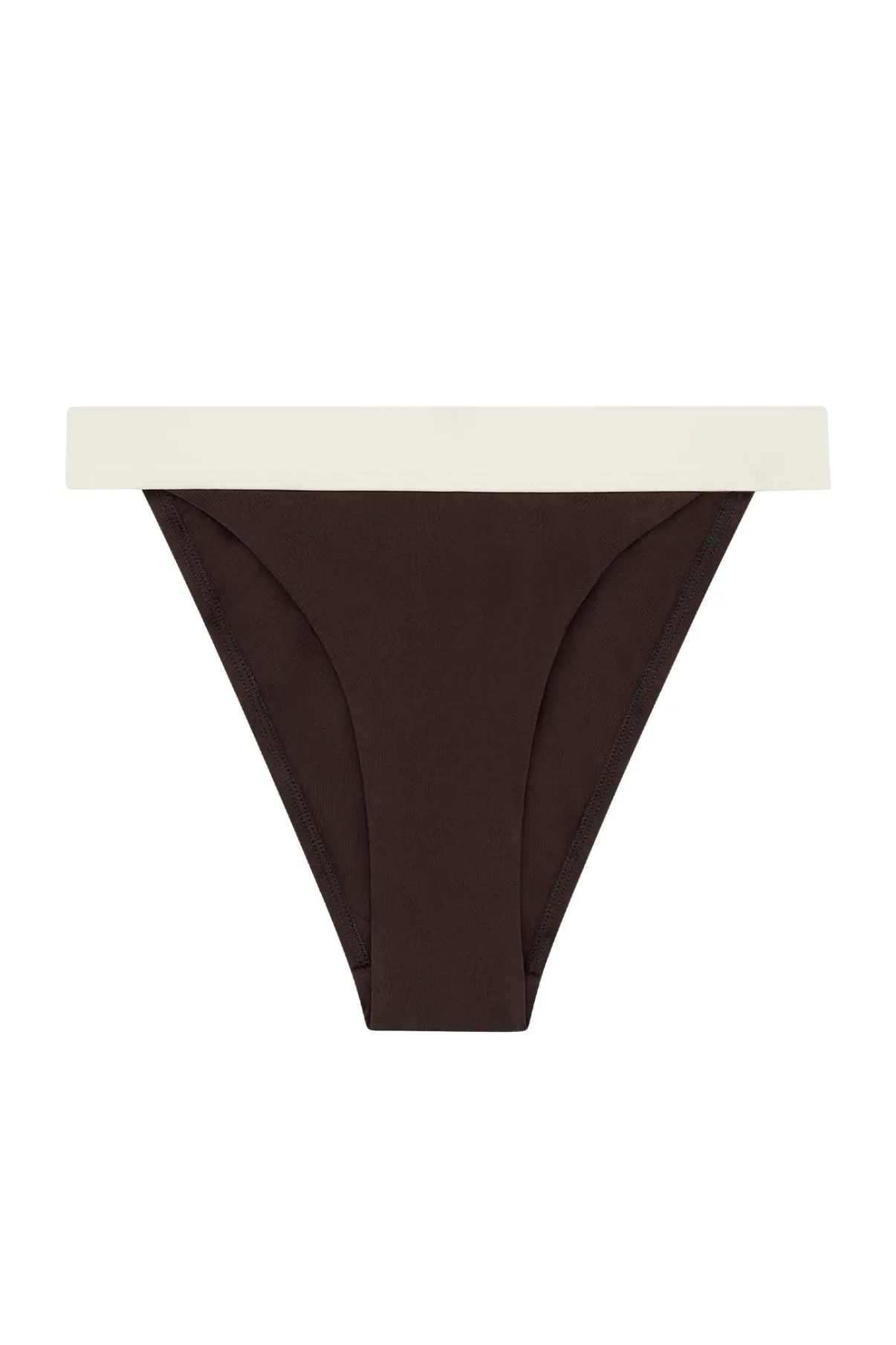 Accentuate your figure in the Santorini Bottom. This mid waist, high leg swim bottom is made to flatter your figure with its color block detail and cheeky coverage for the perfect vacation look.