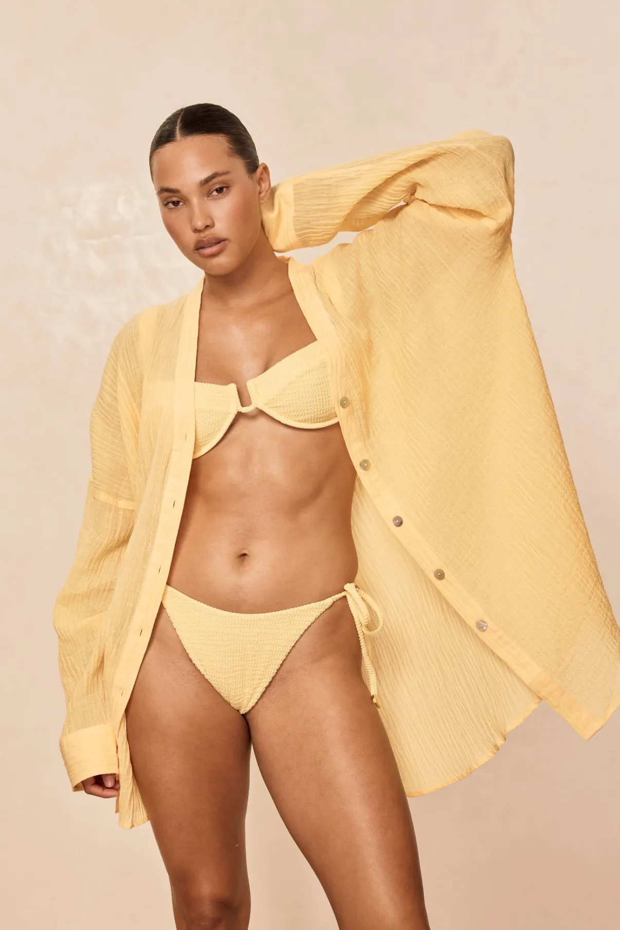 The ultimate beach to bar look can be achieved in the Barcelona Tunic. With an airy oversized fit, this transitional piece can be worn open, over your favorite swimwear or tied at the front with cute pants. Complete with side slits, flowy sleeves and center front seashell buttons.