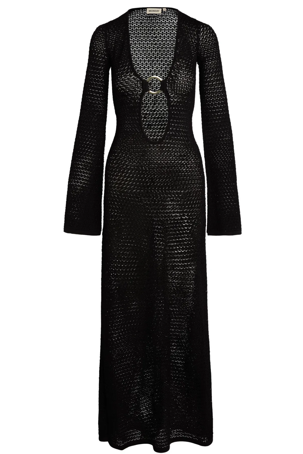 The Montego Dress will make you feel and look your best. Made in a luxe crochet knit, this elegant dress with a plunging neckline, gold ring detailing and high side seam slits will make you brighten up any room you walk in. Paired with any of our swim, this dress will elevate any beach look!