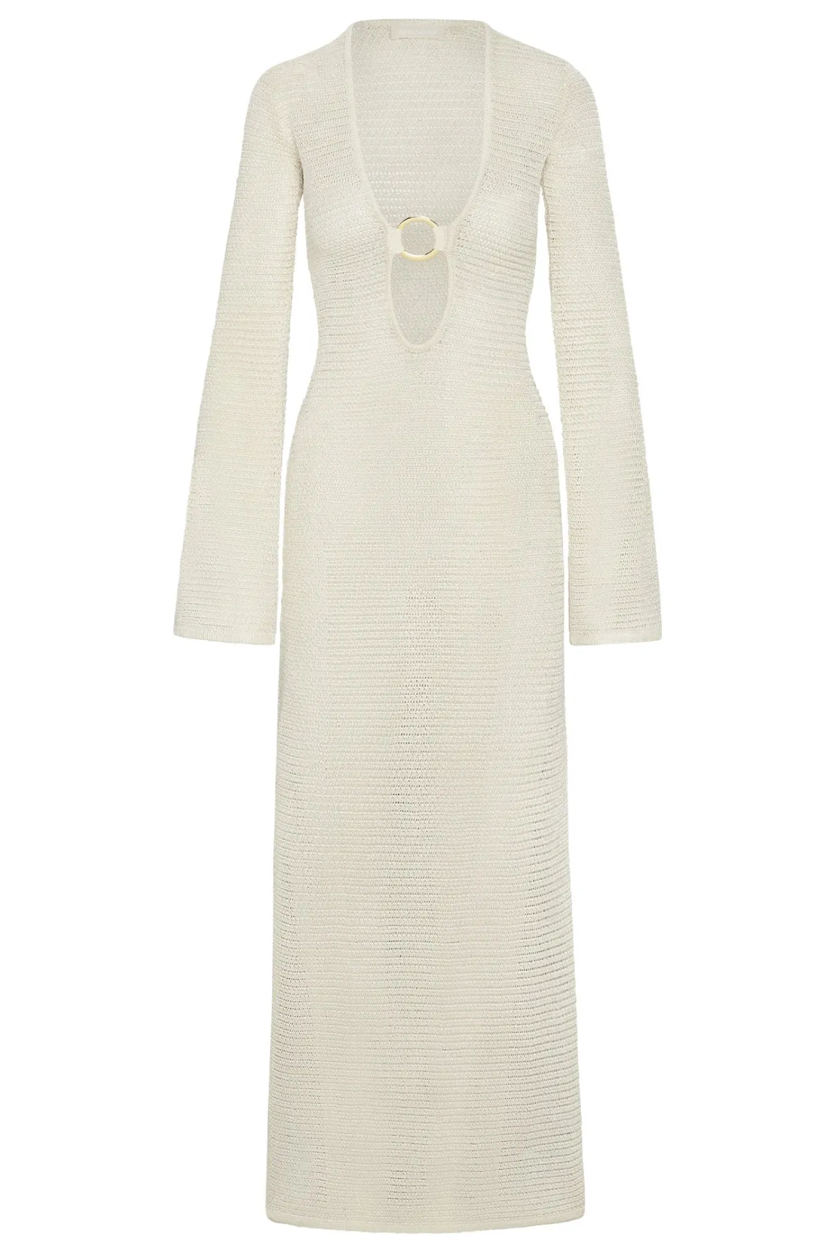 Glamorous and chic! This Montego Dress will make you feel like a star. Made in a lurex crochet knit, this elegant dress with a plunging neckline, gold ring detailing and high side seam slits will make you brighten up any room you walk in. Paired with any of our swim, this dress will elevate any beach look!