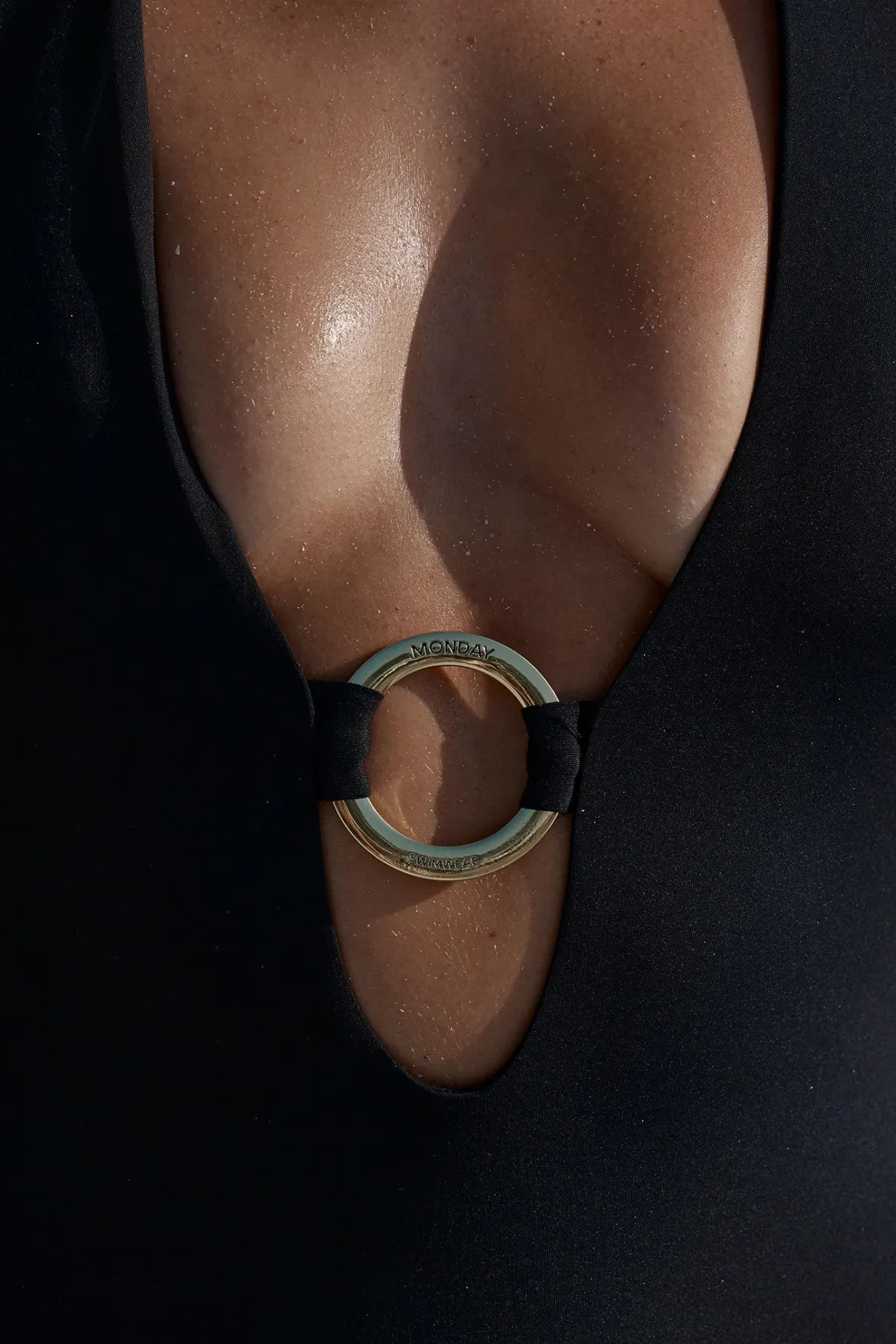 Center front branded metal Monday ring detail