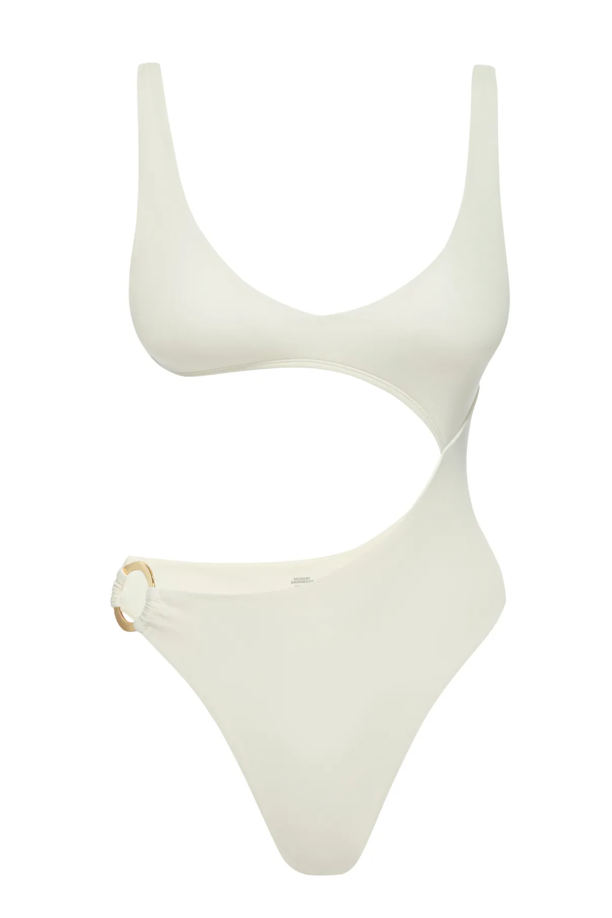 We can’t take our eyes off the St. Barth’s One Piece. From the sultry cut-out detail to the flattering silhouette, this must-have one piece is made to show off your figure. Complete with a rounded v-neckline, adjustable back tie closure and a gold ring detail. All eyes on you!